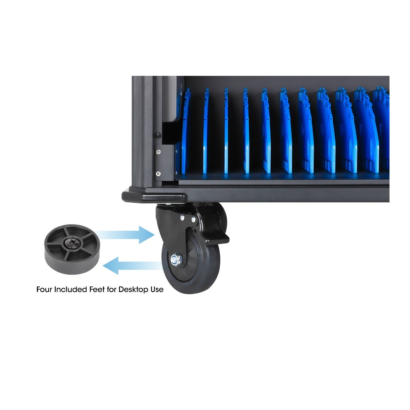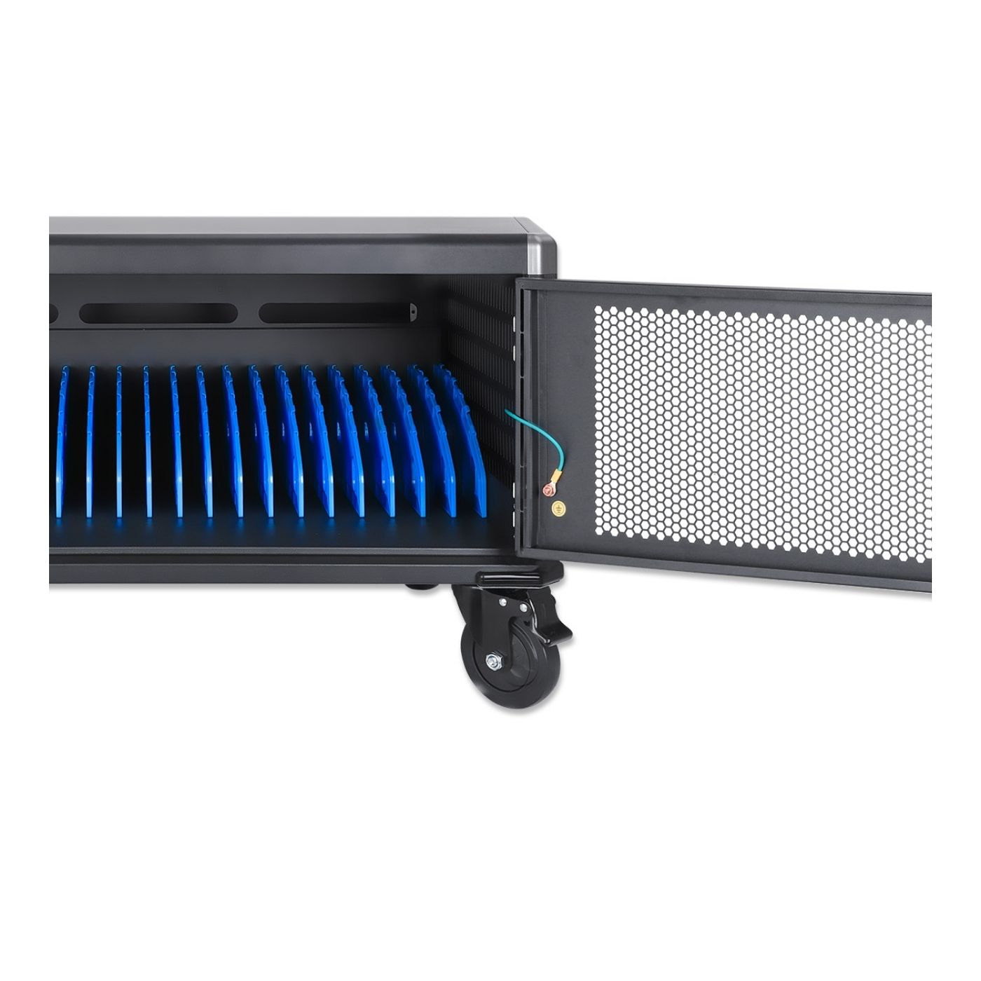 La carcasa de acero de este carro de carga ofrece una señal visible de gestión y protección profesional de los dispositivos. La cerradura de las puertas delantera y posterior se puede abrir con las dos llaves incluidas para ayudar a mantener los dispositivos seguros mientras se cargan o cuando no están en uso. Las ruedas de gran resistencia incluidas le permiten desplazar el carro donde lo necesites; los bloqueos de las ruedas le permiten fijarlo rápidamente en su sitio. Las bahías de ventilación maximizan el flujo de aire para mantener los dispositivos fríos, incluso durante sesiones de carga prolongadas. Carga rápida